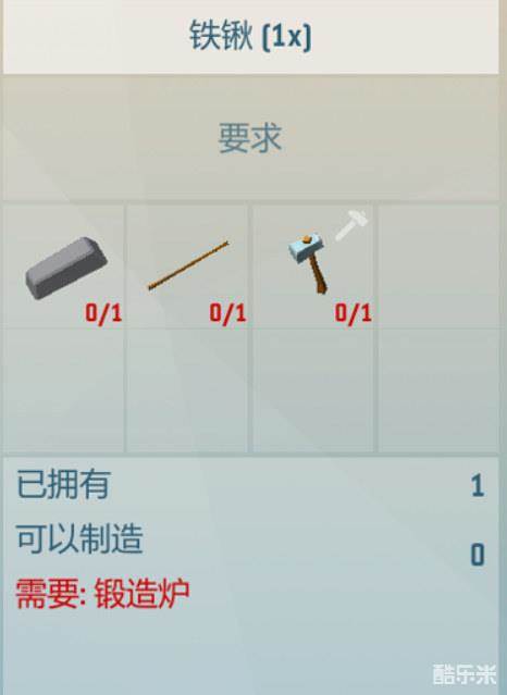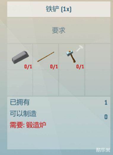 需求1个铁锭、1个木杆、1个锤子在锻造炉中制造。