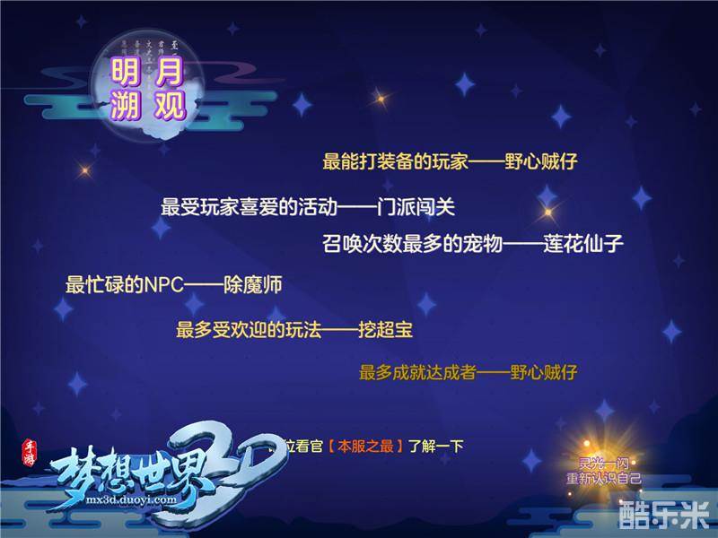 公测一周年以来,《梦想世界3D》推出了众多富有想象力的玩法,其中有不少经典玩法北受各位少侠喜爱。在明月溯观中,你可以看到诸多“本服之最”,最忙碌的npc、最受欢迎的玩法,还有各种玩家排名等你探索!