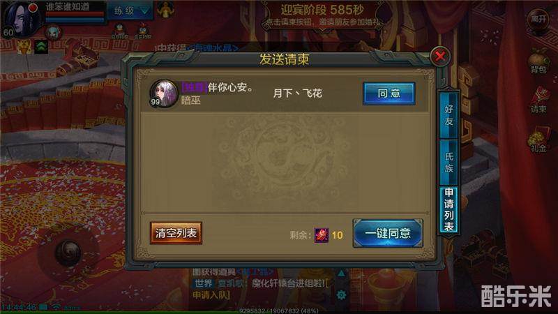 结婚的双方可通过点击请柬,邀请好友或氏族兄弟们前来参加婚礼,也可在申请列表中同意前来参与婚礼的其他宾客,每邀请一个宾客需要消耗一个请柬,请柬可在天圣原NPC婚庆童子处购买,一个请柬价值10金元宝。