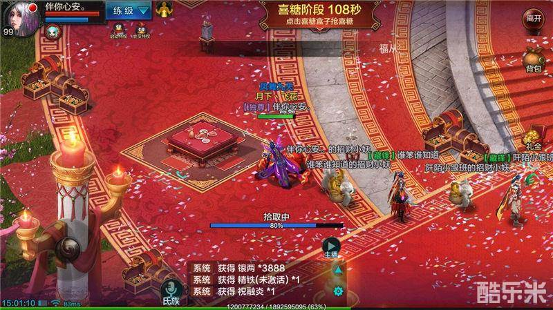 婚礼喜宴、散发喜糖两个阶段想必是来参加婚礼的宾客们的最爱了,参加婚宴的宾客通过在餐桌前点击享用美食,可获得随机物品奖励,传统婚宴有三道菜,豪华婚宴有八道菜。之后新郎新娘甜蜜的开始发喜糖,传统婚礼可发5次喜糖,豪华婚礼可发10次喜糖,宾客们热热闹闹抢喜糖,喜糖可获得大量银两、精铁、宝石、五色石、乾坤宝图材料,山海经材料等各种意想不到的丰厚奖励,考验手速的时刻到了,宾客们,快抢起来吧。