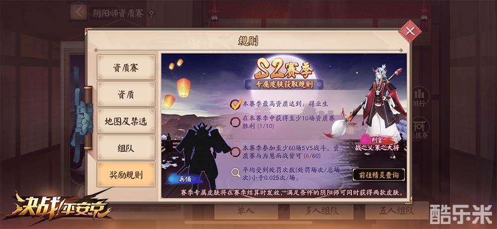 大人们在S2赛季开启后,积极参与对战,并在赛季中最高达到得业生及以上,且资质赛中获取过10个胜利场次,即可在S2赛季末领取判官赛季专属皮肤奖励“战之义?策之大将”!