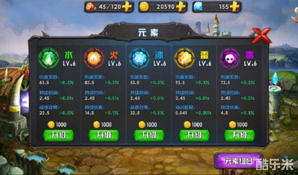 元素玩法真正开放是在玩家30级以后。此时大家可以利用手中的金币为五大元素:水、或、冰、雷、毒一一升级。