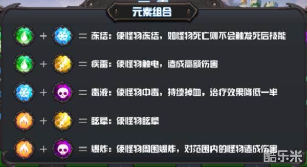 虽然玩家在《元素塔防》中的自主性比较高,能够自由搭配元素,但并不是所有元素组合都能产生效果。一般说来,元素组合有以下五种方式: