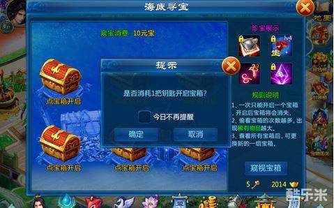 最后编辑于7年前玩家可以在活动中寻找海底寻宝这个活动,点击单个宝箱可直接消耗钥匙开启该宝箱。在这里注意一下,取消取消寻宝界面单个宝箱的窥宝,把价格调整到10元宝一个键窥宝,这样就不会给游戏坑钱了。