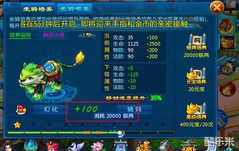 坐骑是一个人物身份的展现,坐骑辅助分为两种:三天、七天。玩家可以在使用坐骑前培养和使用坐骑后培养,一般是要消耗银两的,使用坐骑后培养加的属性比培养前要多,花的银两是一样的。还有一个是摇钱树,它也是分为三天和七天。正常花费1元宝可得:35750银两,使用后可以得到71500银两。