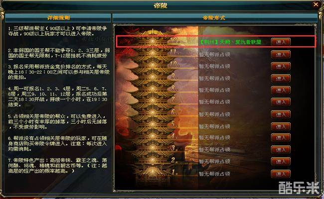 帝陵十二层九十级封印期间,各国可以宣战,可以进行国家国王帮之间的较量,胜利者占领帝陵十二层,提供国民免费进出最高层帝陵的便利。
