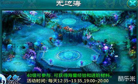 无边海是强大妖兽的乐园,没有实力的玩家就不要有这个念头了吧,只有玩家的人物角色等级达到40级的时候,才可以进去闯荡,海底幻境每天都需要吸收日月精华、补充能量。所以在每天中午的12点35分到13点35分和19点到20点就会开启来吸收天地精华,这也是玩家们进入的时间。无边海内能量达到顶峰,幻境开启!各路仙侠只需守住这两个时间点,就可以进入无边海内领略唯美海底世界,获取海量经验和进阶材料!