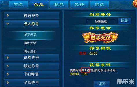 第一名的称号是妙手无双,玩家带上这个称号人物属性的生命会加1500点,有没有瞬间提升血量的感觉。大家注意哦,这只有第一名才有的福利,不是第一名的不会获得。第二名便可以获得眼疾手快的称号,玩家带上后会增加1000点生命。第三名则是得心应手的称号,带上这个称号会获得500点的生命加成!