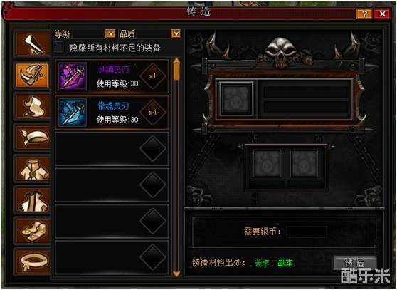 铸造装备需要消耗一种公用材料和一种专用材料,例如铸造一个30级铠甲需要消耗一种30级装备专用材料和一种30级铠甲材料。