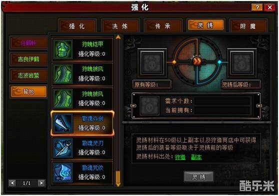 灵铸需要消耗一种公用材料和一种专用材料,例如灵铸一个50级铠甲需要消耗一种50级装备专用材料和一种30级铠甲做材料。