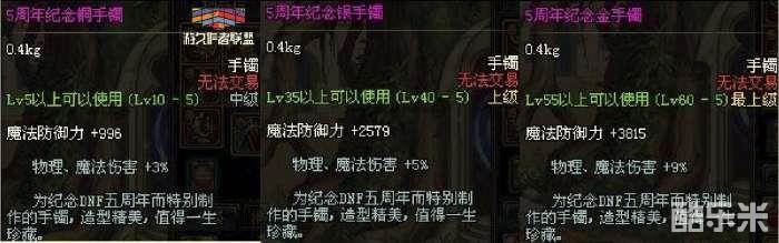 五周年的首饰是纪念手镯,分为三个级别的:铜手镯增加3%的物理/魔法伤害;银手镯增加5%的物理/魔法伤害;金手镯提升9%的物理/魔法伤害。