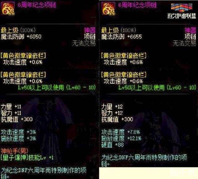 六周年纪念装备中,项链是一大亮点,很多人有了手镯戒指但是没有项链,主要是项链的获取方法是6月21日的整点在线中获取。为什么说项链是亮点呢,因为增加攻击速度和施放速度,当进入决斗场后的攻击速度高达7.8%的,这属性我现在用9周年的项链进去都达不到。