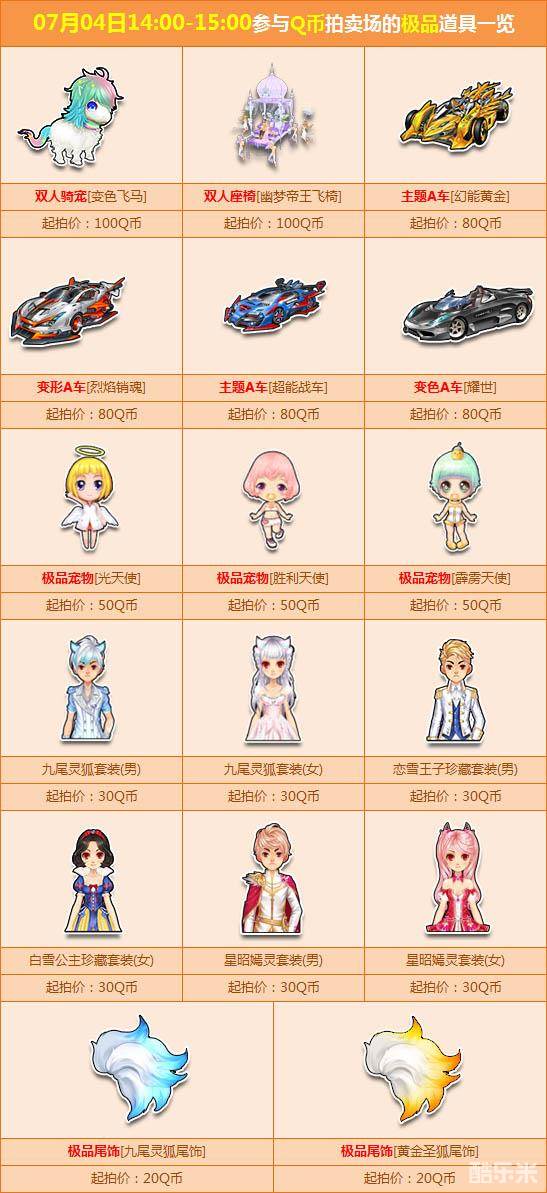 7月4日14:00-15:00期间,Q币拍卖会强势来袭,极品双人骑宠【变色飞马】闪耀降临,还有【幽梦帝王飞椅】绝美来袭,各式极品A车、极品宠、极品套装也争相登场,购买Q币券可以参与拍卖(1个Q币券 = 1Q币),Q币券还可用于在商城购物抵用Q币使用,精彩活动不容错过!