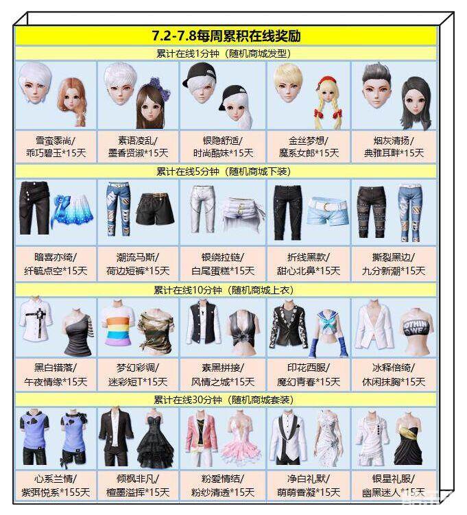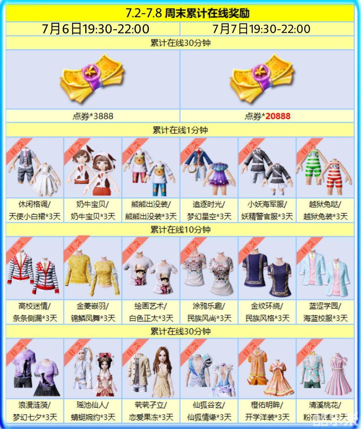 7.6-7.7,周内累计在线1分钟、10分钟和30分钟,即可获得非卖服装和宝儿套装,还有24776点券送给你!