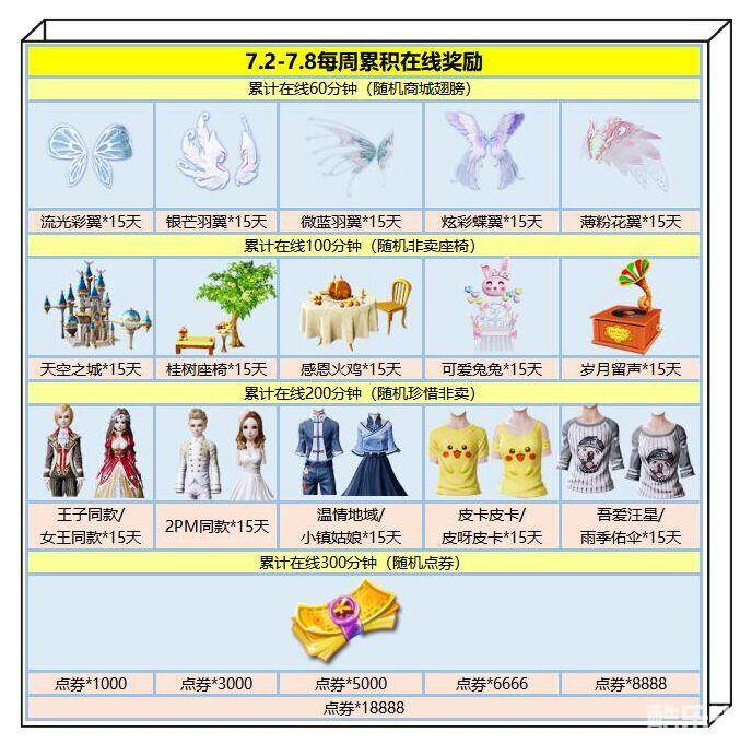 7.2-7.8,周累计在线1分钟、5分钟、10分钟、30分钟、60分钟、100分钟、200分钟、300分钟、送你精美服饰,更有非卖座椅送给你!座椅天天换,金币/非卖服饰免费穿!
