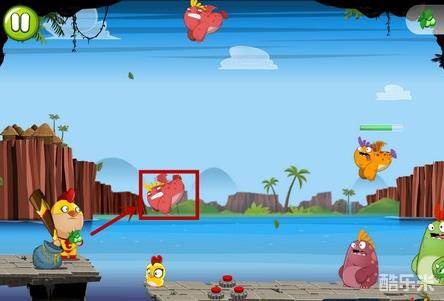 答:对付高空妖怪的最好办法就是看好位置再打,以为它们在空间,水果子弹很难打到它们,而它们下降来抓小鸡的速度也非常快,这时候玩家就要看好位置(ps:如图示处),一击即中,就能很好的消灭妖怪了。