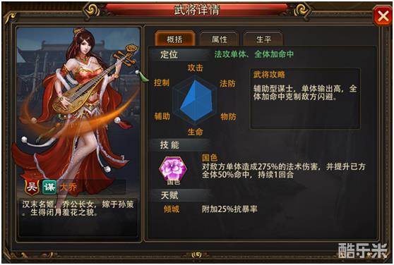 小编今天给大家带来《鏖战三国》大乔的详细介绍,让你对大乔这张卡牌更加了解,多多关注我们《鏖战三国》区,小编会带来更多的攻略。