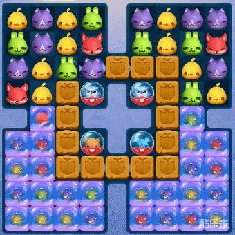3、本关并不掉落棕色和蓝色棋子,想要获取它们,必须攻击棋盘下方的两个万能孵化蛋,由孵化生成在棋盘上。所以在消除了障碍物后,尽量多的攻击这两个万能孵化蛋是通关的关键所在。此外,孵化出的棋子,会优先填充在对应的彩色玻璃上,积累足够数量后很容易自动消除,并制造出特殊棋子。同颜色特殊棋子的范围攻击,可消除范围内的对应颜色玻璃哦。