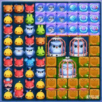 1、本关的主要任务,需要将棋盘的所有棋格铺设上草坪。已经铺设草坪的位置棋盘右下角,我们需要先消除其上的障碍物,才能将草坪延伸出来。这里障碍物非常的密集,我们很难找到消除机会。不过棋盘右上的果冻内,均藏着一只猫头鹰,且随着棋子消除,补充掉落的棋子中也有猫头鹰。所以我们开局先找机会消除棋盘上的果冻,匹配猫头鹰去消除棋盘右下角的障碍物即可。