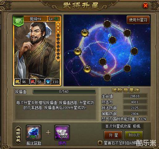 2. 武将升星需要消耗星宿石和银两,星数越高每次所需消耗的星宿石也会随着增长。