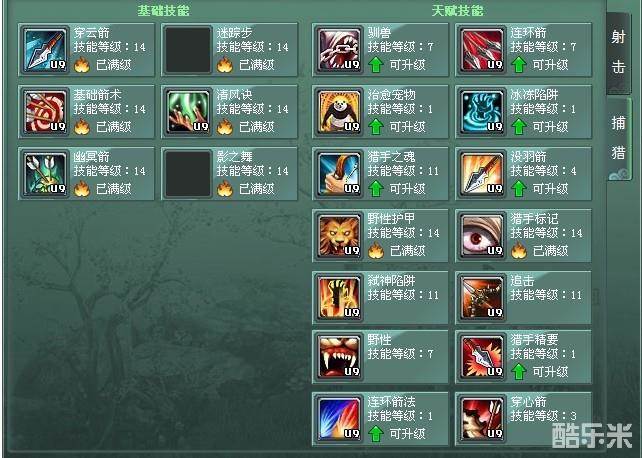 穿心箭/穿魂箭:3点(等级不够),后期主要输出技能。兽王谷的独门箭法,直击要害,带有3569点攻击力,并有3%的机率忽视目标防御。