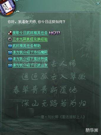 武林精英任务:想试试自己的运势?每日可找王城NPC:张天师(421,435)接取当日随机任务,任务类型与品质全屏运势获得,运气好不好,试试手气才知道。