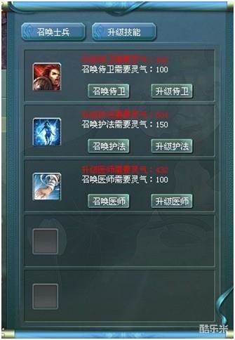 召唤士兵界面,玩家可以消耗一定的灵气值,对三种守卫进行召唤和升级操作。