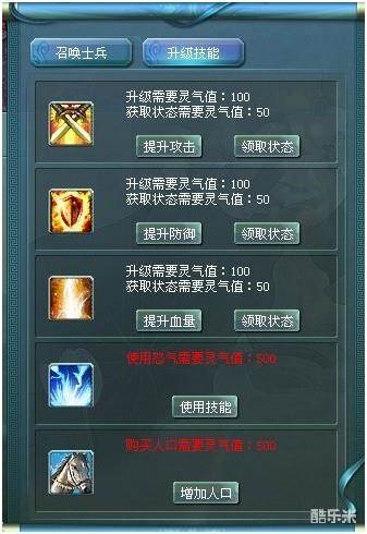 升级技能界面,玩家可以消耗一定的灵气值领取状态来提升自己角色的攻防血量,或者释放怒气技能打范围杀伤怪物血量,以及增加人口来提升可召唤的守卫数量。