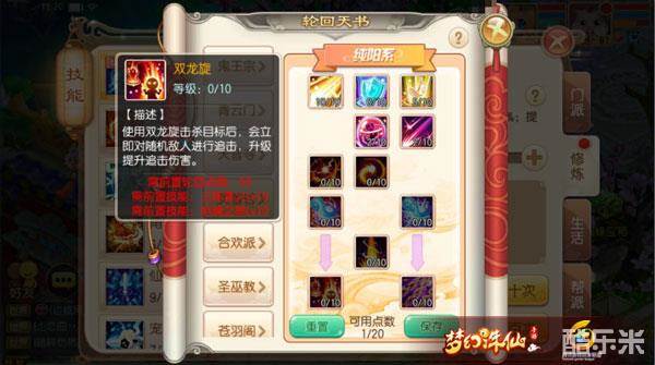 说了这么多,我们来讲一下焚香轮回技能,“通玄”、“凌波”这俩个技能必须是要点满的。攻击和速度是输出门派的核心。重点来说一下“双龙”。双龙是必须要点满的技能,通过强化“双龙旋”可获得击杀目标后进行追击的能力,如果在攻击前还触发了坐骑效果“侵蚀”,就相当于一回合造成了四次伤害,自然伤害总量十分可观,并且在竞技对抗中焚香就是用“双龙旋”来进行单体点杀的,所以学习“三昧真火”→“双龙旋”的技能路线最为合适!