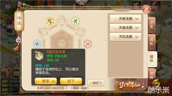 最后为大家带来关于法宝的镶嵌。浮屠金钵这件法宝可以镶嵌天枢,天璇,天玑这三种龙晶,分别可以增加物攻;法攻;封抗这三种属性。我们可以更具自己的职业来进行镶嵌,可以将法宝的作用充分发挥出来。
