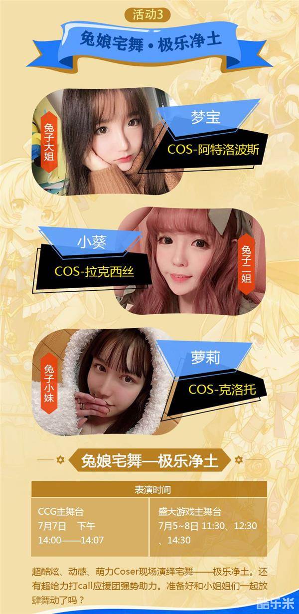 三位萌娘将会COSER兔耳三姐妹,兔子军团终将统治世界!三位兔娘除了会在展台现场进行摆拍走秀之外,还将登台出演兔娘宅舞——极乐净土的热力舞蹈节目。点燃全场守护者的热情。