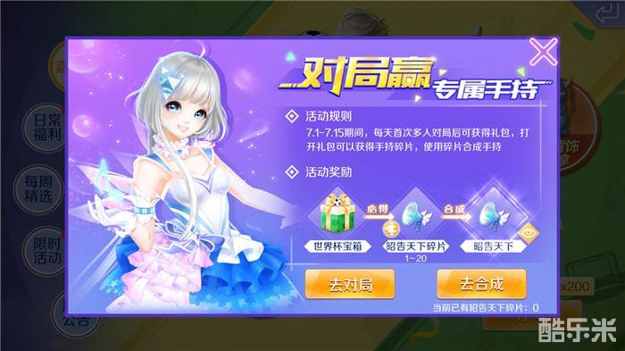 在“打歌赢专属饰品”活动中,玩家们只要在7月1日至15日期间,每天第一次参加多人对局后就可以获得世界杯宝箱,打开礼包可以获得1到20个手持碎片,男生可以获得碎片,女生可以获得“昭告天下”碎片,使用碎片可以合成 或“昭告天下”喇叭手持。