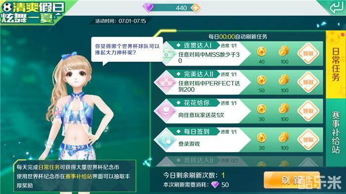 在“赢世界杯限定球服”活动中,玩家每天登陆QQ炫舞手游完成日常任务就可以获得大量的世界杯纪念币,使用世界杯纪念币在赛事补给站界面可以抽取丰厚的奖励!活动任务非常简单,通过活动指定的对局、社区活动等日常活动就可以轻松获得纪念币啦!每天0点会自动刷新任务,大家一定要及时登录QQ炫舞手游完成任务领取奖励哦!