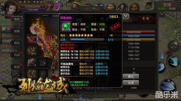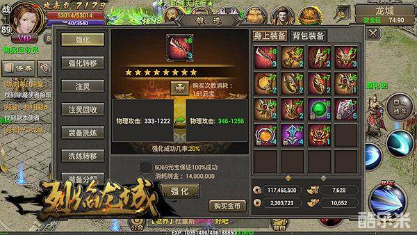 把自己的装备进行最后的强化,强化需使用绑金,每次强化有一定几率成功,也可使用元宝获得100%成功率。每件装备的强化次数是有限的(越高级的装备次数越多),当强化次数不足时需花费元宝购买。强化成功会提升强化星级,最高12星,星级越高属性提升越多,同时消耗的绑金也越多。强化可以转移,当更换新装备时,可以花费元宝或绑金将原装备的强化星级转移至新装备。