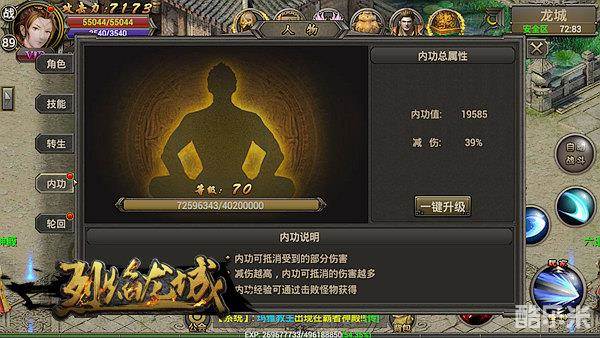 内功可以抵消玩家角色受到的部分伤害,减伤越高,内功可以抵消的伤害就越多,内功经验可以通过击败怪物获得,所以大战前夕,没事儿多挂挂机,内功值在战场团战时可以让你抵抗对方攻击更加持久!