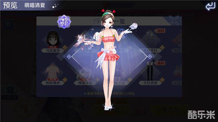 原来直接抽奖还可以得到现成的一件衣服,看看物品一览里,除了我获得的这条短裙以外,在这里抽奖还有机会得到“马尾辫发”、“纯黑学院”等发型、“嘻哈耳钉”配饰、还可以获得整套服装呢,这里面我还非常喜欢这个“萌喵清夏”的比基尼套装,在这个炎热的夏天里,看着“自己”试穿这套比基尼短裙套装,真的觉得自己都凉快了不少呢,看来我要努力咯!