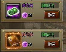 国库商店:初级国库即可购买,25点贡献买一本,限购五次,我们捐2W银两就有5贡献,30元宝50贡献(算起来和花元宝购买一样)