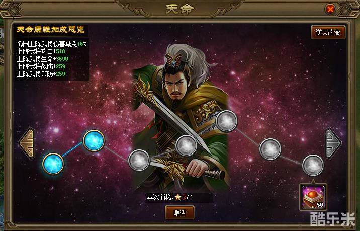 天命属性还有根据国家来进行加成的,你选的是吴国,那么首发阵容里的吴国武将伤害减免达到28%,其他的国家无效!如果你后期得到多个其他国家的极品武将,可以选择逆天改命来改变君主相性,花点元宝就可以了,V6可以同时激活两个国家,V8可激活三个郭嘉,V10最全能,四系全修!
