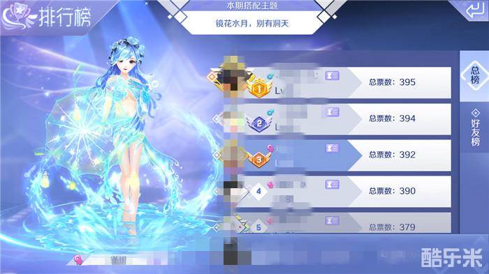 大家对于搭配赛还是非常有经验的,“镜花水月,别有洞天”,突出的主题是“水”,排行榜中的总榜冠军是一个男生,搭配的是一身银色西装、咖啡色的背头,这样的搭配十分干净又不出挑,在饰品搭配方面,除了自己戴了蓝色镜框、手持一束玫瑰花以外,还搭配了蝴蝶翅膀与水花光效,十分契合主题。而玫瑰花手持也算是整套搭配中最亮眼的颜色,可以说是点睛之笔,获得冠军的搭配,获得了395票,可以说是众望所归!