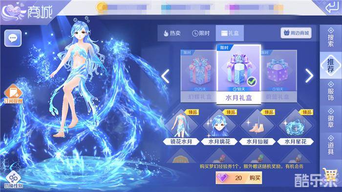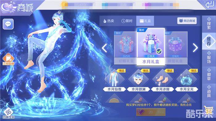 下面我们再来看一下这套“水月礼盒”的男生套装吧!男生有机会得到“水月仙霓”套装、“水月微澜”发型、“水月冰履”和“水月尘光”光效等组成,整体套装为蓝色系,在视觉上给人一种海洋的清凉感,加上“水月尘光”的光效搭配,像水中王子,在浪花中飞舞。这套服饰套装对于本期的评选赛来说是非常贴近主题的,在商城中只需要20个钻石就可以购买一个水月礼盒,小伙伴们快去试试手气吧!