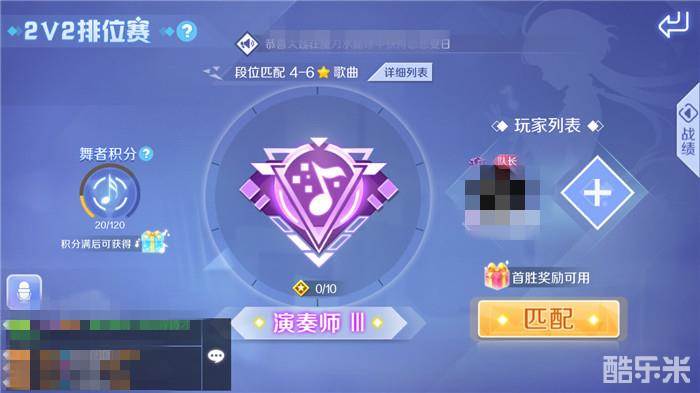 首先大家在游戏界面中找到对战中心,进入后可以看到游戏界面最右边的2V2排位赛,点击进入后,界面主要显示了自己的排位情况和当前段位匹配到的歌曲难度,左边显示了舞者积分,当舞者积分积满后还可以获得礼包哦!在最右边的玩家列表中,点击加号可以邀请朋友,也可以直接进行匹配,系统会随机为你选择一位队友进行组队!