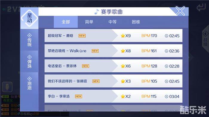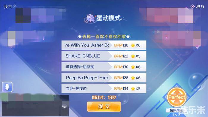 在对战开始之前,每个人都有权利选择去掉一首自己不喜欢的歌曲, 在这个时候大家可以规避开自己不擅长的音乐。在这里建议大家在平时可以去音乐实验室中勤加练习,不仅可以练习不同难度的歌曲,也可以练习不同的游戏模式。在2V2排位赛中,每个赛季的歌曲是不同的,如果大家想要在排位赛中获得好成绩,可以针对自己段位匹配到的歌曲难度集中练习哦。