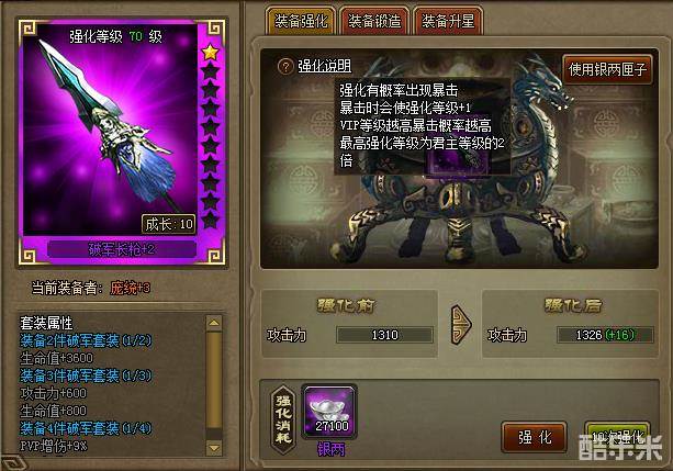 首先是强化,每次强化都可以提升装备的基础属性,需要消耗到大量的银两,强化的时候运气好可以出现最高4倍暴击,但需要注意的是,装备强化等级最高不能够超过君主等级的两倍,游戏里满级是100级,也就是装备最高能够强化到+200!
