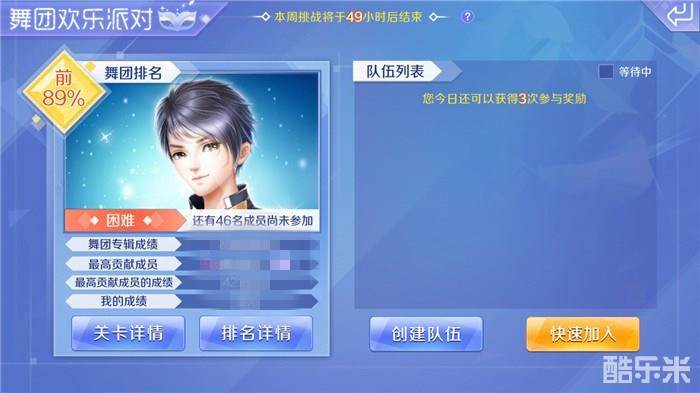 大家在每周五至周日登录QQ炫舞手游的舞团中可以开启舞团的欢乐派对,舞团的排名如何,也决定着舞团成员们的奖励是否丰厚。活动开放期间,每天都可以获得3次参与奖励,如果在进入欢乐派对时没有可以快速加入的队伍,大家可以自行创建队伍,来邀请舞团成员一起完成哦!