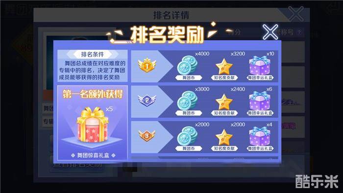 在舞团欢乐派对结束后,系统会根据排名发放对应的奖励。获得第一名的舞团除了可以获得4000舞团币、3200知名度贡献、10个舞团幸运礼盒外,还可以额外获得5个舞团惊喜礼盒,有机会获得高档服饰哦!舞团币可以在舞团商店中购买自己喜欢的服饰道具,这么丰厚的奖励,你是不是动心了呢?