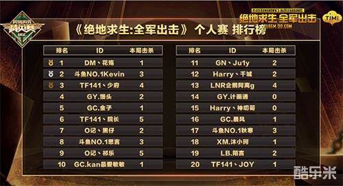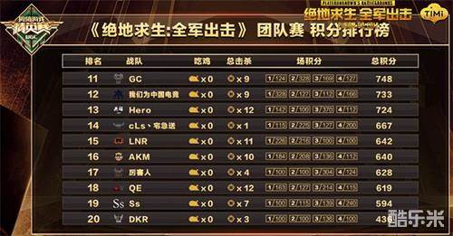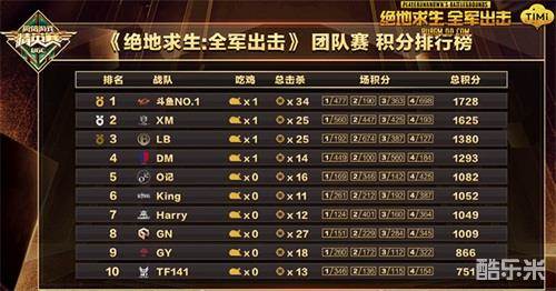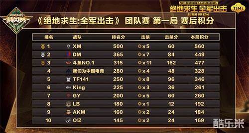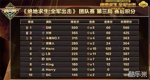 团队积分赛第三局“DM战队”以5杀、排名第一的成绩获得560积分,“XM战队”以5杀、排名第二的成绩获得425积分,“斗鱼NO.1”以4杀、排名第三的成绩获得363积分。其中“LB战队”虽然未能进入前三,但仍获得了11次击杀,实力非凡。