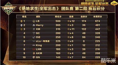 团队积分赛第二局,“LB战队”以12杀、排名第一的成绩获得674积分,“XM战队”以11杀、排名第三的成绩获得447积分,“Harry战队”以3杀、排名第二的成绩获得401积分。当比赛进入决赛圈时,只剩“Harry战队”独狼与“LB战队”三人队,形成一对三的局面,最终“Harry战队”一人难敌三手落败,“LB战队”顺利吃鸡!