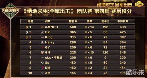 团队积分赛第四局“斗鱼NO.1”战队以14杀、排名第一的成绩获得698积分,“O记战队”以5杀、排名第二的成绩获得425积分,“King战队”以6杀、排名第三的成绩获得387积分。本局决赛圈的最后阶段,只剩“斗鱼NO.1战队”与“KING战队”,形成4比3的局面,但由于“KING战队”占据的位置不佳,被团灭,“斗鱼NO.1”顺利吃鸡!