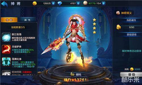 在《大圣之怒》7月版本中上线的哪吒则是因为悟空蟠桃而被天庭迁怒,处以削肉剔骨之刑。他的品阶为四星,是仙族神将,脚下不停转动的风火轮、背后的乾坤圈和身上的混天绫让他威风凛凛,霸气十足。作为全能型神将,哪吒既有爆炸的输出又能很好地辅助主角。可谓是居家旅行、杀人越货的必备良品!