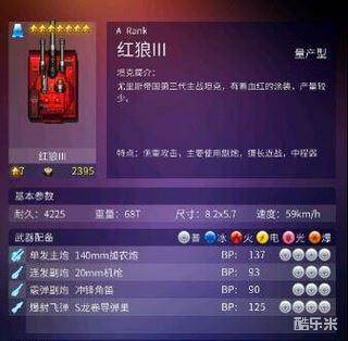 在机战坦克中狼3绝对是所有坦克中推图性价比最高的,主炮配合底盘加上S龙卷导弹巢能打出不错的爆发伤害,最值得一提的是冲锋角笛,散弹副炮的属性配合火神炮速射技能能打出大范围上万的爆发伤害,但该技能释放时是在各副炮间切换所以不能开启2改武器机枪。4225点基础耐久媲美大部分S级坦克,生存能力不错,推荐新人尽早入手。